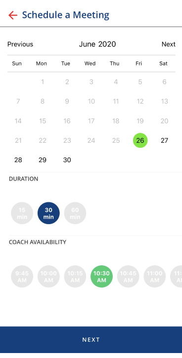 After that, you can easily find a time when you and your coach are both mutually available. Just tap "Schedule a Meeting" in their mobile app menu or "Schedule" in the Leader portal at leader.leaderamp.com. You will then have access to the scheduling tool.